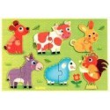 Encastrement en bois Coucou Prairie, 12 pièces. 6 animaux de la ferme de 2 pièces chacun à reconstituer et à encastrer sur un plateau en bois. Les pièces débordent du plateau pour faciliter le positionnement et la préhension. Dimensions du plateau (L x l x H) : 29,5 x 20,5 cm, épaisseur 1 cm. Épaisseur des pièces: 0,5 cm. Dès 18 mois.