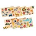 Lot de 7 encastrements en bois assortis. Puzzles en bois composés d''1 plateau et de 6 à 9 pièces chacun. Dessins naïfs aux couleurs vives de plusieurs thèmes: les véhicules, les services, la ferme, la mer et les animaux sauvages. Le bouton fixé sur chaque pièce permet une préhension facile par les tout petits. Permet de développer la motricité fine et la coordination oeil/main. Livrés sur un présentoir en carton épais qui permet de les saisir et de les ranger facilement. Dimensions (L x l): 29,8 x 20,8 cm. Epaisseur : 0,7 cm. Dès 2 ans.