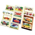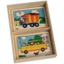 Boite de 10 puzzles en bois 6 à 8 pièces les véhicules. Trés belle boite en bois verni avec couvercle contenant 10 puzzles bois aux couleurs trés vives, tous différents, constitués de 6 à 8 pièces. (voiture, hélicoptère, bus, avion, moto, camion benne, locomotive, bateau, tractopelle, tracteur).Plateau en bois de 20 x 14 cm. Epaisseur du plateau 1cm.