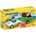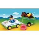 Cavalière avec voiture et remorque 1-2-3. 1 voiture avec remorque, 1 cavalière, 1 cheval et 1 valise. Dimensions de la voiture avec remorque : L.25 x l.7 x H.14 cm. Dès 18 mois.