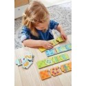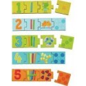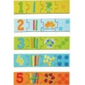 Puzzles d’associations, les chiffres de 1 à 5. 5 puzzles de 4 pièces en bois qui représentent les chiffres de 1 à 5 et leurs quantités par des animaux, des traits et des points. Pour aider les enfants, les puzzles ont une couleur différente et des découpes auto-correctives. Stimule la concentration et développe la reconnaissance et l’apprentissage des chiffres et des couleurs. Dimensions d’un puzzle : L.22 x l.5 x ép.0,5 cm. Dès 2 ans.