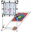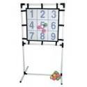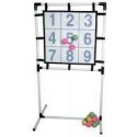 Portique d''adresse hauteur 140cm. Portique en plastique muni d’une cible double face de forme carrée en plastique très résistant (60x60cm), avec revêtement type velcro. Sur une face des chiffres de 1 à 9 et sur l’autre face une cible numérotée de 50 à 5. Livrée avec 6 balles de couleur style tennis pour organiser les équipes. Dimensions : l.77xH.140cm A partir de 3 ans.