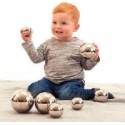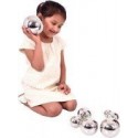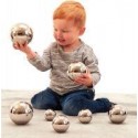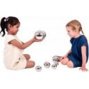 Boite de 7 balles sonores argent. En acier inoxydable, chacune des 7 boules produit un son et un mouvement différent. Elles sont légères, lisses et faciles à manipuler. La surface brillante permet aux enfants de se voir avec un effet déformé ce qui développera leur curiosité. Diamètre : de 5 à 11cm.