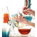 Boite de 10 flacons 45ml de peinture VITREA 160. Peinture à l’eau, brillante et translucide pour décorer le verre, le cristal, la porcelaine, la faïence et la céramique. 10 couleurs assorties : jaune soleil, paprika, rouge piment, bleu lazuli, turquoise, vert émeraude, vert santal, terre brûlée, noir d’encre et voile blanc. Couleurs prêtes à l’emploi et miscibles entre elles. Mode d’emploi : Avant d''appliquer la peinture, nettoyer le support à l''eau savonneuse. Après 24 heures de séchage minimum, mettre l''objet décoré dans le four froid. Une fois la température de 160°C atteinte, cuire 40 minutes. A la fin de la cuisson, ouvrir le four et laisser refroidir l’objet à l’intérieur afin d’éviter tout choc thermique. Seules les surfaces non destinées à être mises en contact avec les aliments doivent être décorées. Après cuisson, les couleurs résistent au lave-vaisselle. Excellente tenue à la lumière. Nettoyage des outils à l''eau savonneuse.