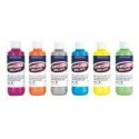 Lot de 6 flacons 250 ml de peinture acrylique MAJUSCULE, couleurs tendances. 6 coloris assortis, effet nacré : jaune flash, vert acide, abricot, bleu d''orient, gris acier et fuchsia. Prête à l''emploi, cette peinture forme, une fois sèche, une pellicule brillante imperméable et indélébile. Elle s''applique sur tous les supports : papier, plâtre, poterie, verre, carton, etc... Toutes les couleurs se mélangent entre elles. Nettoyage à l''eau froide avant séchage.