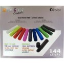 Classpack de 144 sticks de gouache coloris assortis. Gouache solide en stick de 10g pour les petits et les grands. 12 x 12 couleurs assorties: blanc, jaune, orange, rouge, rose, vert clair, vert foncé, bleu clair, bleu foncé, violet, marron et noir. Facile à utiliser, ne tâche pas et sèche rapidement. Sans eau, sans pinceau. Aspect cire ou aspect gouache, la couleur est satinée, pas besoin de vernis. Grand pouvoir couvrant.