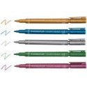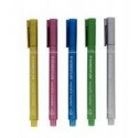 Blister de 5 marqueurs metallique assortis. Idéal sur papier clair ou foncé, carton, pâte FIMOair après séchage. Utilisable immédiatement. Encre pigmentée à base d''eau. Pointe ogive 2,7mm. Effaçable à l''aide d''un chiffon humide sur surfaces lisses telles que le verre, les miroirs. Largeur de trait : 1,2mm.