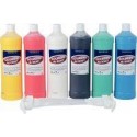Lot de 6 flacons 1L de gouache aux doigts + 6 pompes couleurs assorties: noir, blanc, bleu, rouge, vert et jaune. Cette gouache sensorielle permet aux enfants de s''exprimer en toute liberté et sans danger. Peinture épaisse et onctueuse à base d''eau qui s''applique directement du bout des doigts sur le papier, le carton... Livré avec 6 pompes à fixer sur les flacons pour doser la gouache aux doigts par simple pression. Les tâches s''éliminent facilement à l''eau. Convient aux enfants de - de 3 ans.