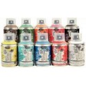 Lot de 10 sprays 100ml de peinture acrylique. Peinture en spray idéale pour supports difficiles à peindre et pour le travail avec des pochoirs. Coloris assortis: blanc, jaune, orange, magenta, rouge de noël, bleu, turquoise, vert de noël, chocolat, noir. S’applique sur tous supports: carton, polystyrène, béton, papier, métal, plastique, verre, plâtre, bois, pierre... Petit format adapté aux plus petits. Haut pouvoir couvrant. Couleurs opaques et superposables, effet mat. Utilisation en intérieur ou en extérieur. Après 24h de séchage complet, la peinture est indélébile, permanente et résiste aux intempéries. Agiter avant emploi. Nettoyage à l''eau et au savon. A base d''eau, sans solvant, odeurs très discrètes. 100 ml = 0,75 mètre carré.