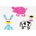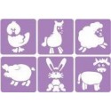 Paquet de 6 pochoirs en plastique thème ferme. 6 pochoirs différents par pochette. Dimensions : 14 x 14 cm. Pour obtenir un bon résultat avec un pochoir, fixer le pochoir sur la surface à décorer avec de la bande adhésive. Utiliser une brosse à pocher d''un diamètre suffisant par rapport au motif à réaliser. Utiliser une peinture suffisamment épaisse. Bien évacuer l''excédent de peinture de la brosse à pocher, puis effectuer des mouvements circulaires dans le pochoir. Ne pas tamponner, ce qui aurait pour effet de faire baver la peinture sous les bords du pochoir. Les enfants peuvent utiliser un pinceau mousse.