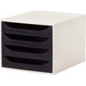 Module 4 tiroirs Ecobox de couleur gris et noir. Réalisé à partir de bouteilles de jus de fruits recyclées. - Caisson individuel à 4 tiroirs au format A4+. - Tiroirs ouverts permettant l’introduction directe de documents sans ouvrir les tiroirs. - Coulissement parfait des tiroirs, avec butée de sécurité - Proportions idéales pour votre bureau.