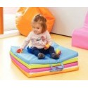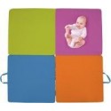 Tapis 3 en 1 100x100 4 couleurs assorties. Tapis d’éveil 3 en 1 en polyester, utilisable en tapis de jeux et fond de parc (100x100x4cm), en tapis de repos (50x100x8cm), ou en pouf (50x50x16cm). Muni de deux hanses de transport, il est livré dans un sac de rangement. Déhoussable et lavable à 30°, séchage à plat.